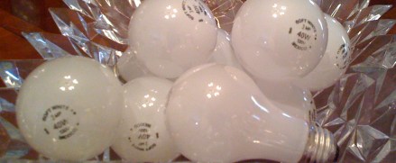 When CFLs first hit the scene a few years ago, I was excited about it. A new light bulb that would save energy and last much, much longer! I bought ’em, compared ’em. Now, not so excited. Incandescent bulbs created more light than the same watt CFL bulb. How much light a bulb emits is important to me. I read. A lot. And I need good light to do that until the wee hours of the morning. Why? Because I have something like 20-80 vision. Glasses help of course, but the cataracts make it more difficult. (I am having surgery to fix that little problem in a few weeks so maybe that’s not a valid argument.)