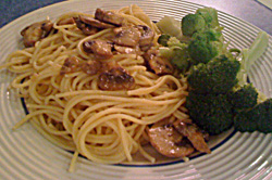 Heat 4 cups water until boiling. Add spaghetti and cook until tender (but not too soft). In the meantime, melt butter in a saute pan then add mushrooms. Add garlic salt to suit your taste. Saute over medium-high heat until they look like they’re supposed to.* Stir to keep from burning. When done, add spaghetti to mushrooms and mix thoroughly. Serve with french bread and steamed broccoli. Serves one adult and one slightly starved 7-year-old.